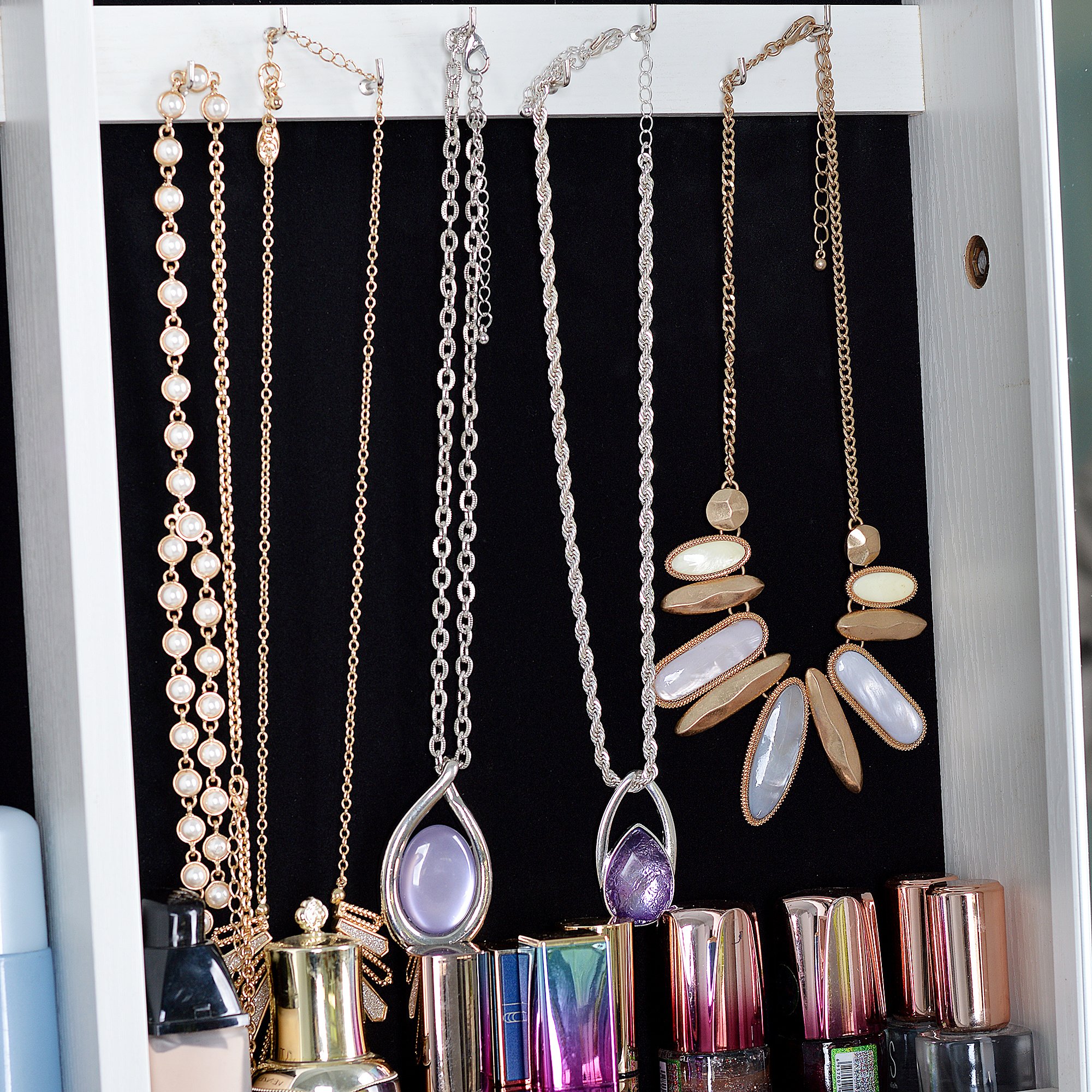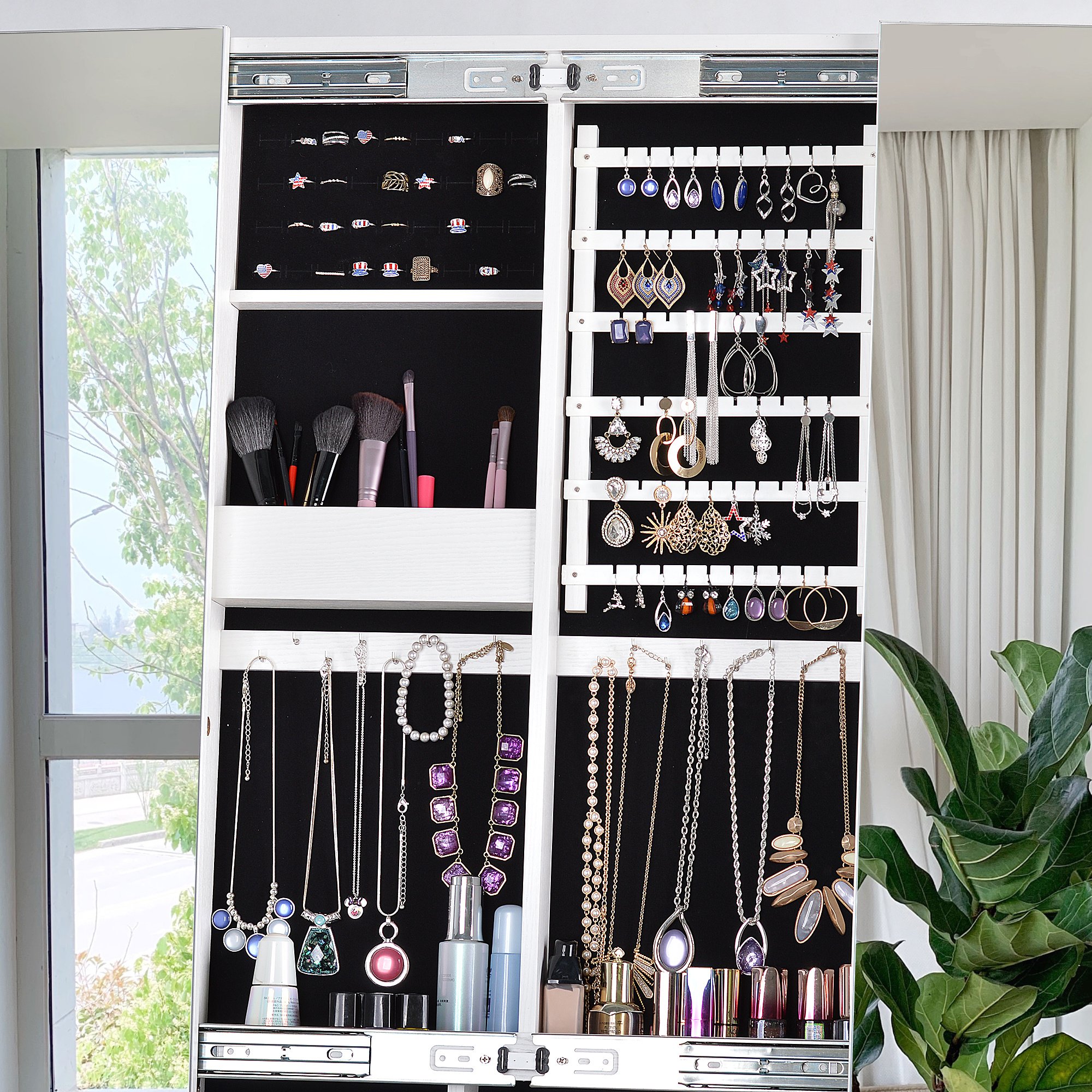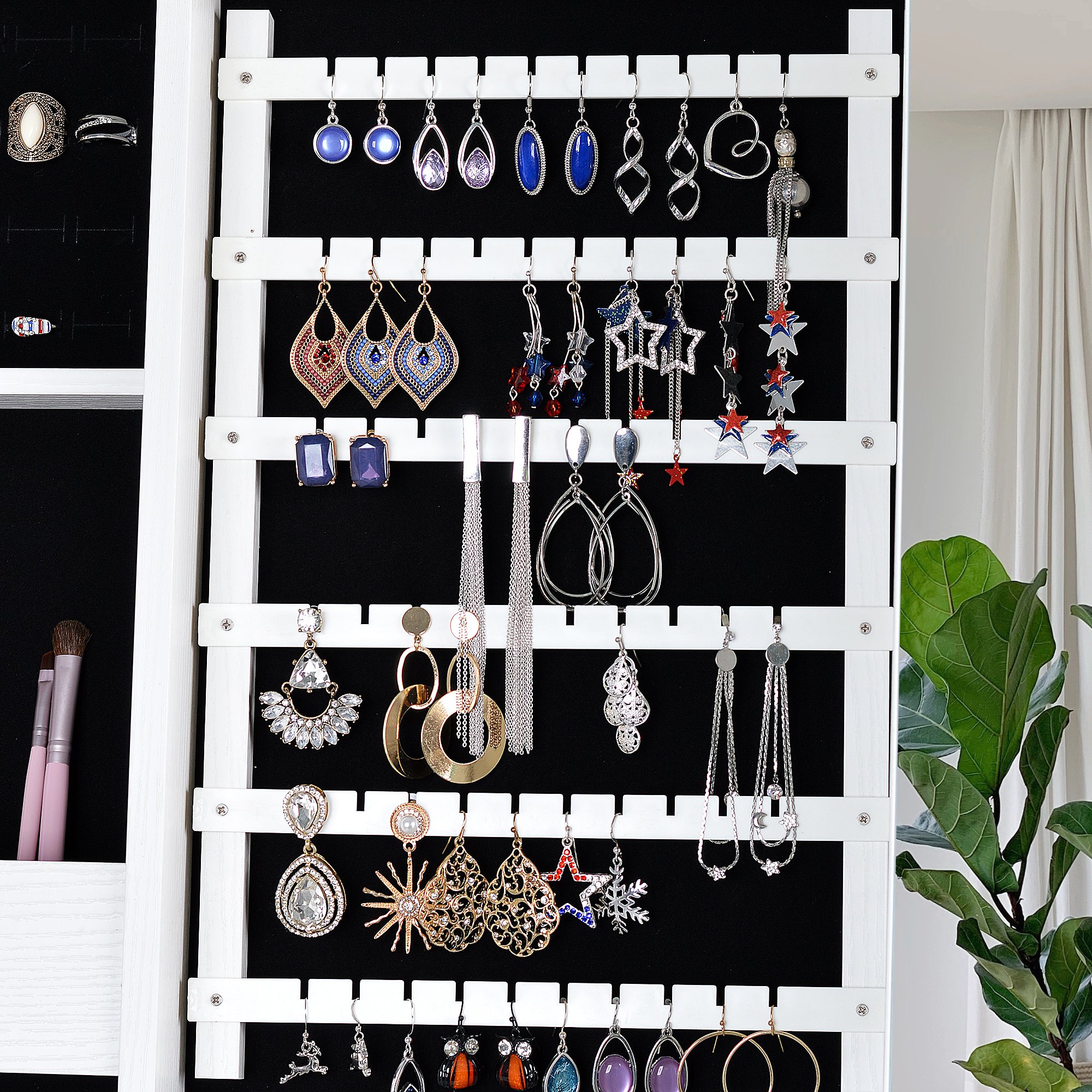Ample storage: includes 50 rings,22 necklace hooks, 2 cubes, 4 lined shelves and a bracelet rod, and plenty of room for rings and earrings.it can hold on the door or wall.