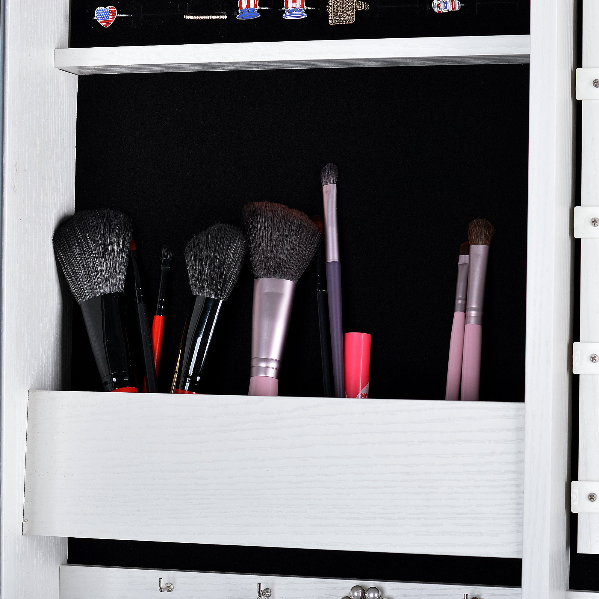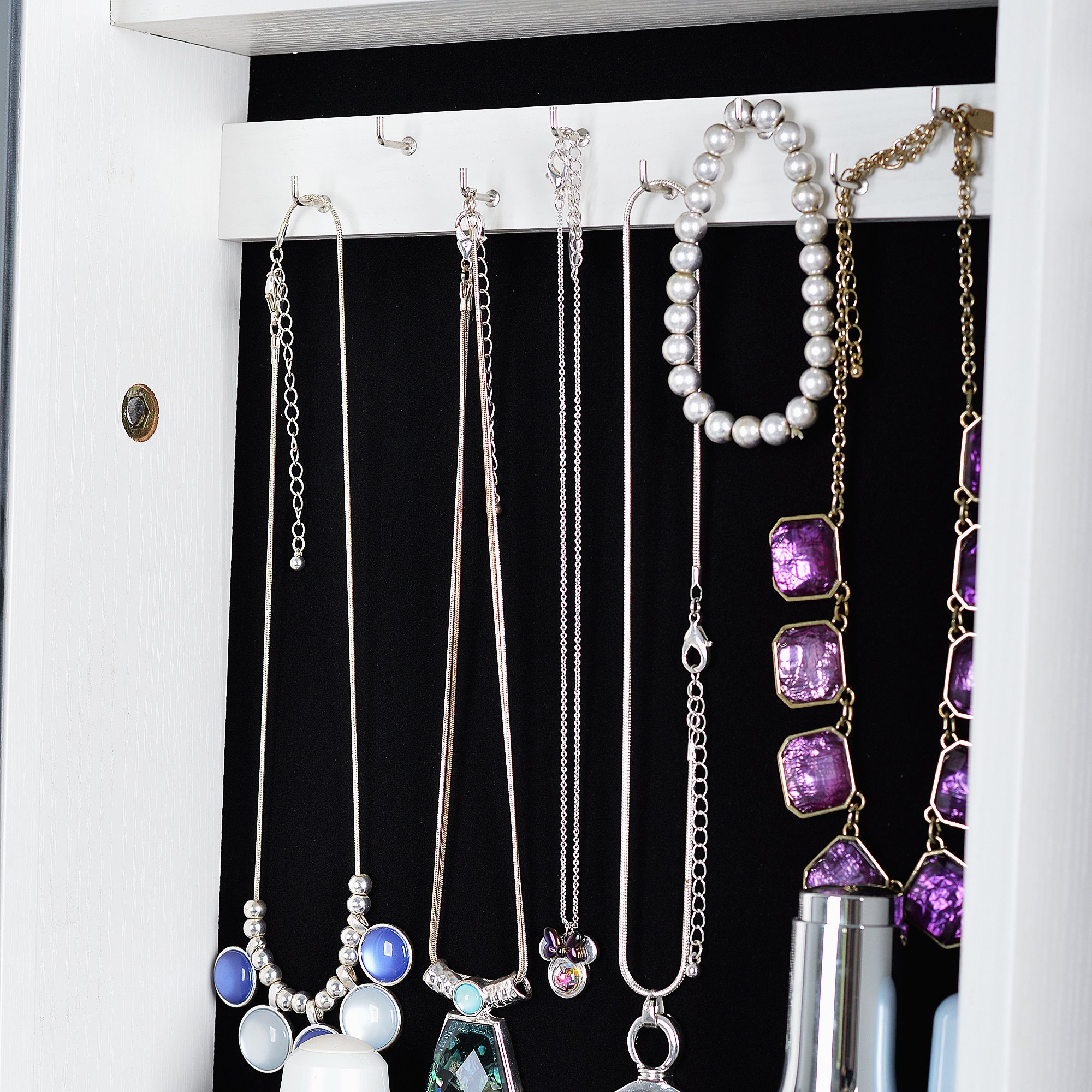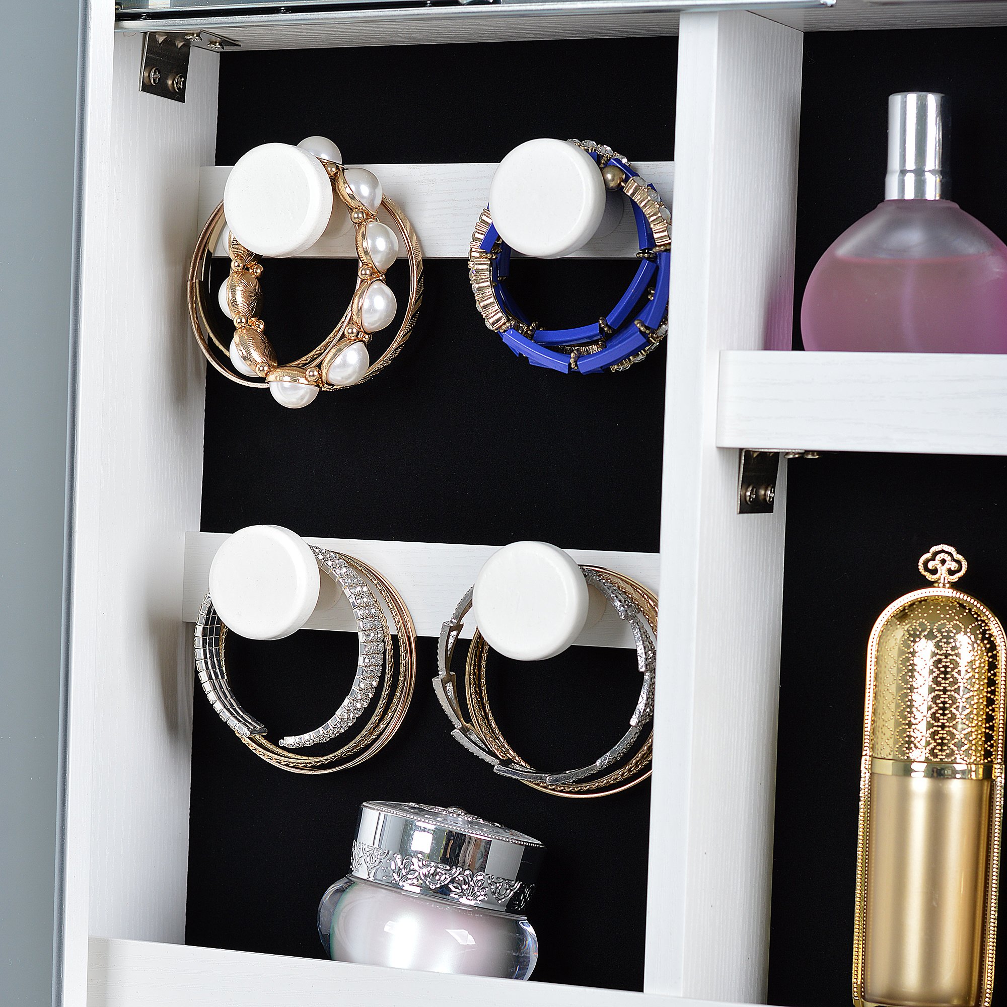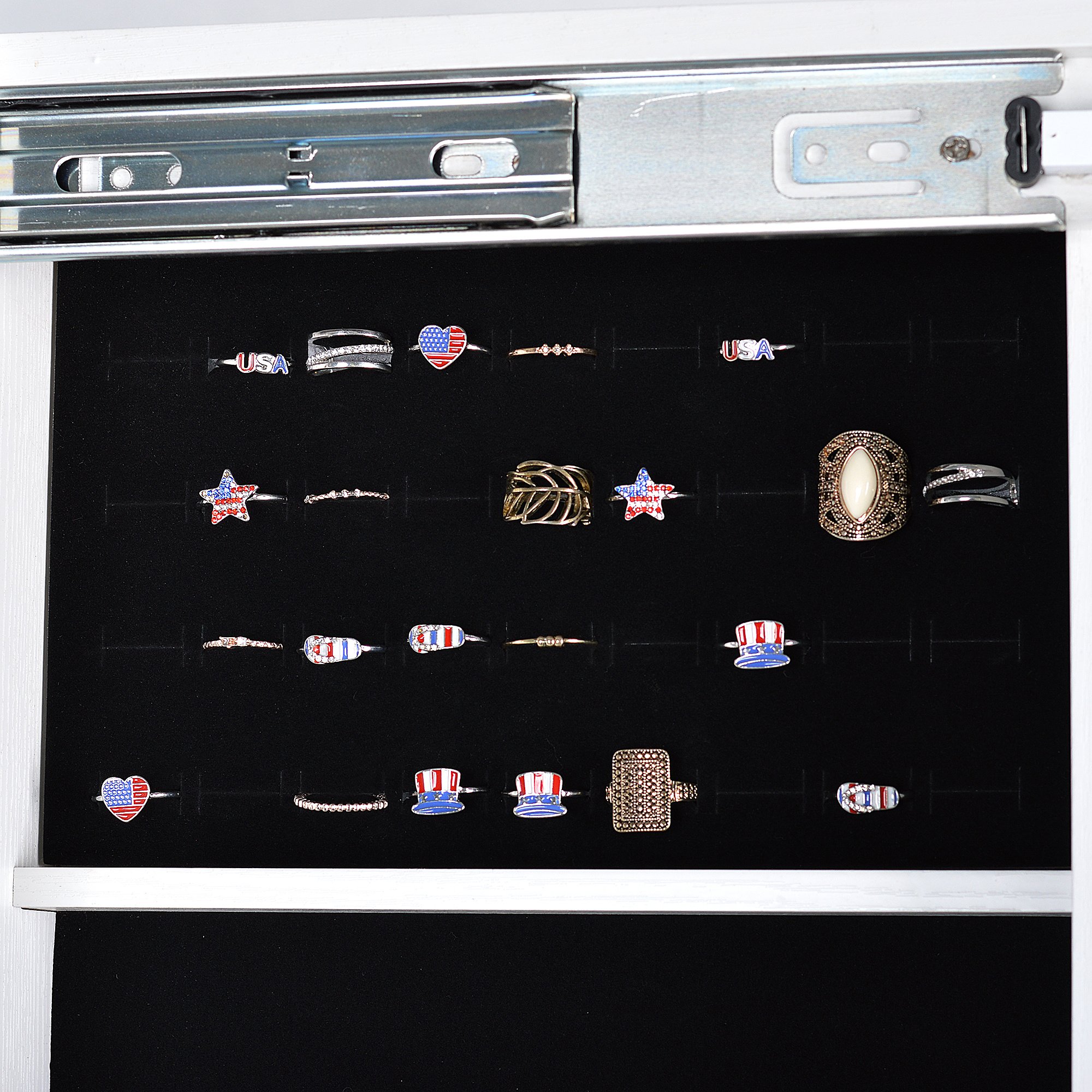 Ample storage: includes 50 rings,22 necklace hooks, 2 cubes, 4 lined shelves and a bracelet rod, and plenty of room for rings and earrings.it can hold on the door or wall.